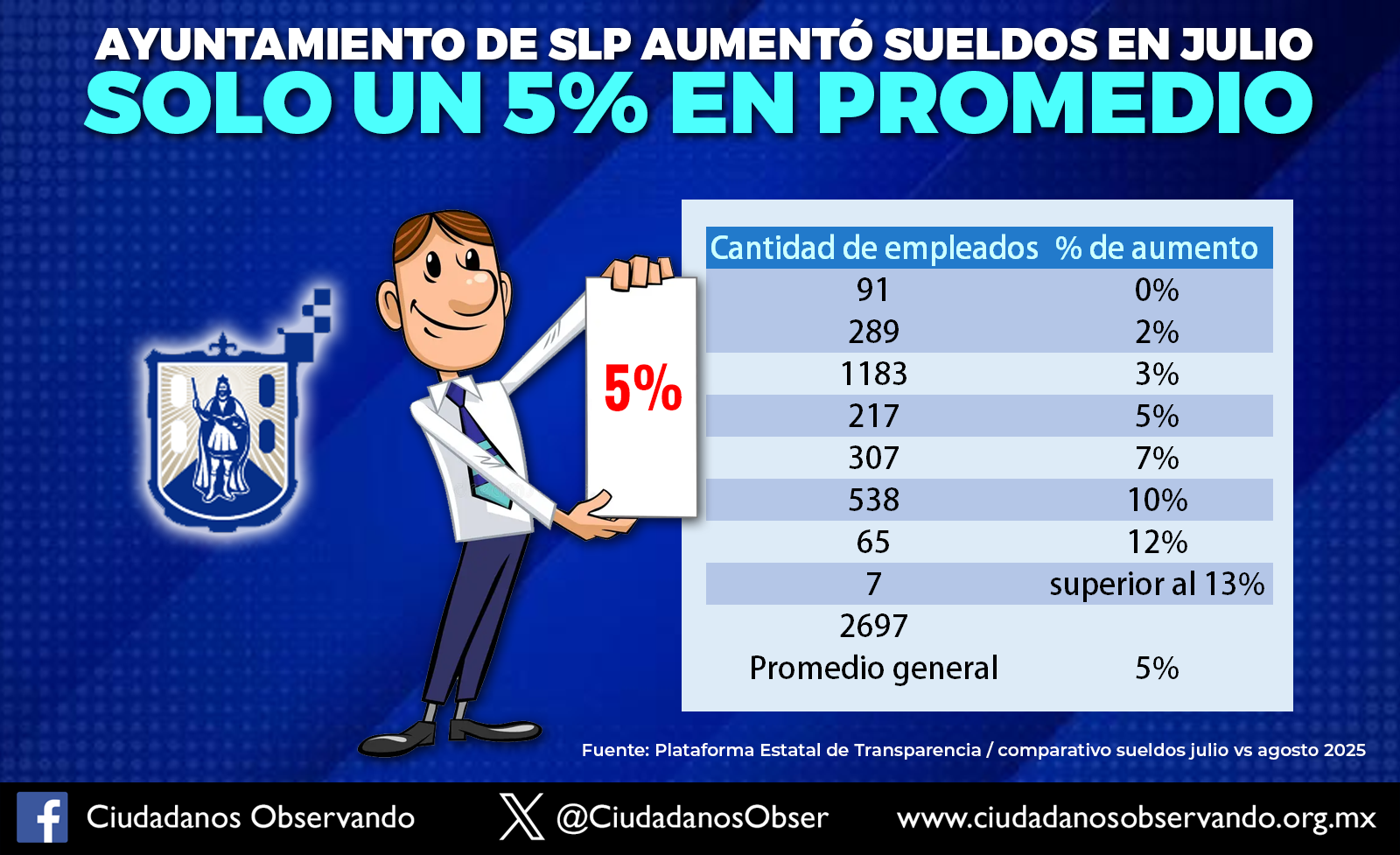 Sin embargo, tras analizar los datos publicados en la Plataforma Estatal de Transparencia —comparando los sueldos de julio y agosto de 2,697 empleados municipales— los resultados distan mucho de lo prometido por las autoridades.
