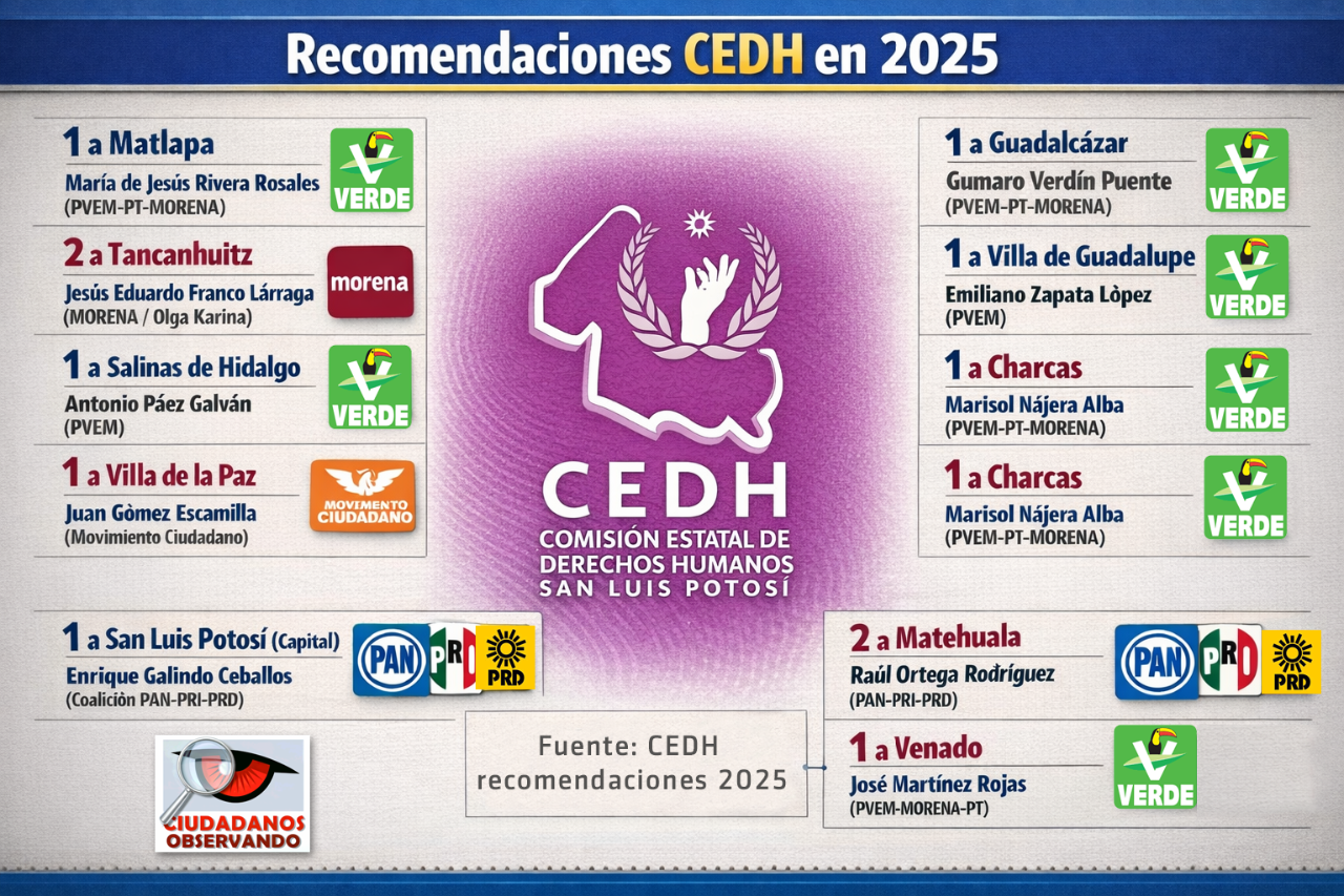 El análisis político también resulta inevitable. Actualmente el Partido Verde Ecologista de México (PVEM) gobierna en 30 municipios del estado. Sin embargo, al revisar el color partidista de los ayuntamientos recomendados en 2025, se observa que no podían faltar aquellos encabezados por fuerzas distintas al Verde. Este dato, aunque no concluyente por sí mismo, alimenta la percepción de un posible sesgo selectivo en la emisión de recomendaciones.