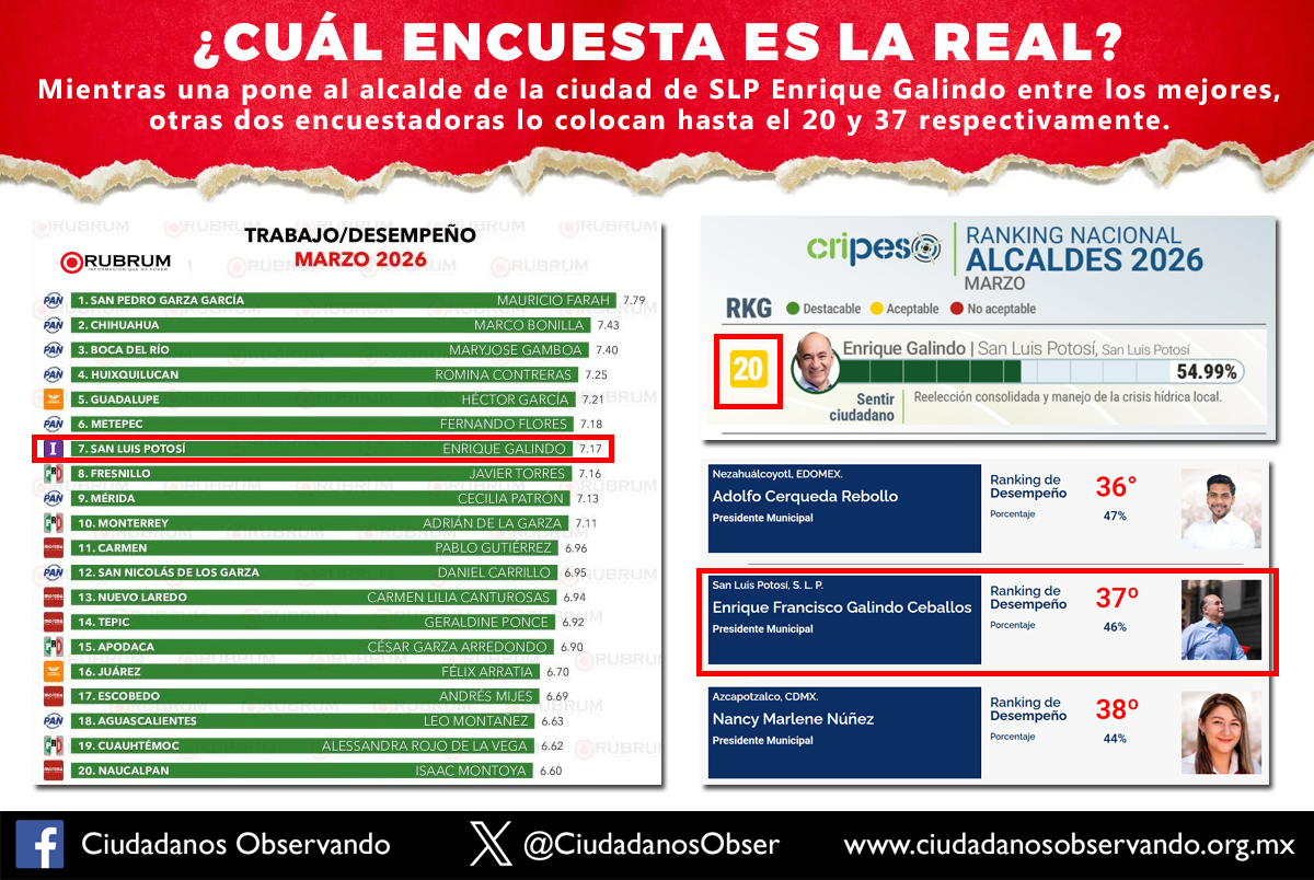 Este tipo de comparativos muy difícilmente los podrás encontrar en otros medios. No vamos a quitar el dedo del renglón para señalar las enormes inconsistencias que publican las diferentes empresas encuestadoras, ya que como se puede ver en este ejemplo, por un lado Rubrum presenta al alcalde de San Luis Potosí Enrique Galindo entre los mejores 7 de país, otras como Cripes o Ranking Alcaldes de México lo colocan hasta el lugar 20 y 37 respectivamente.