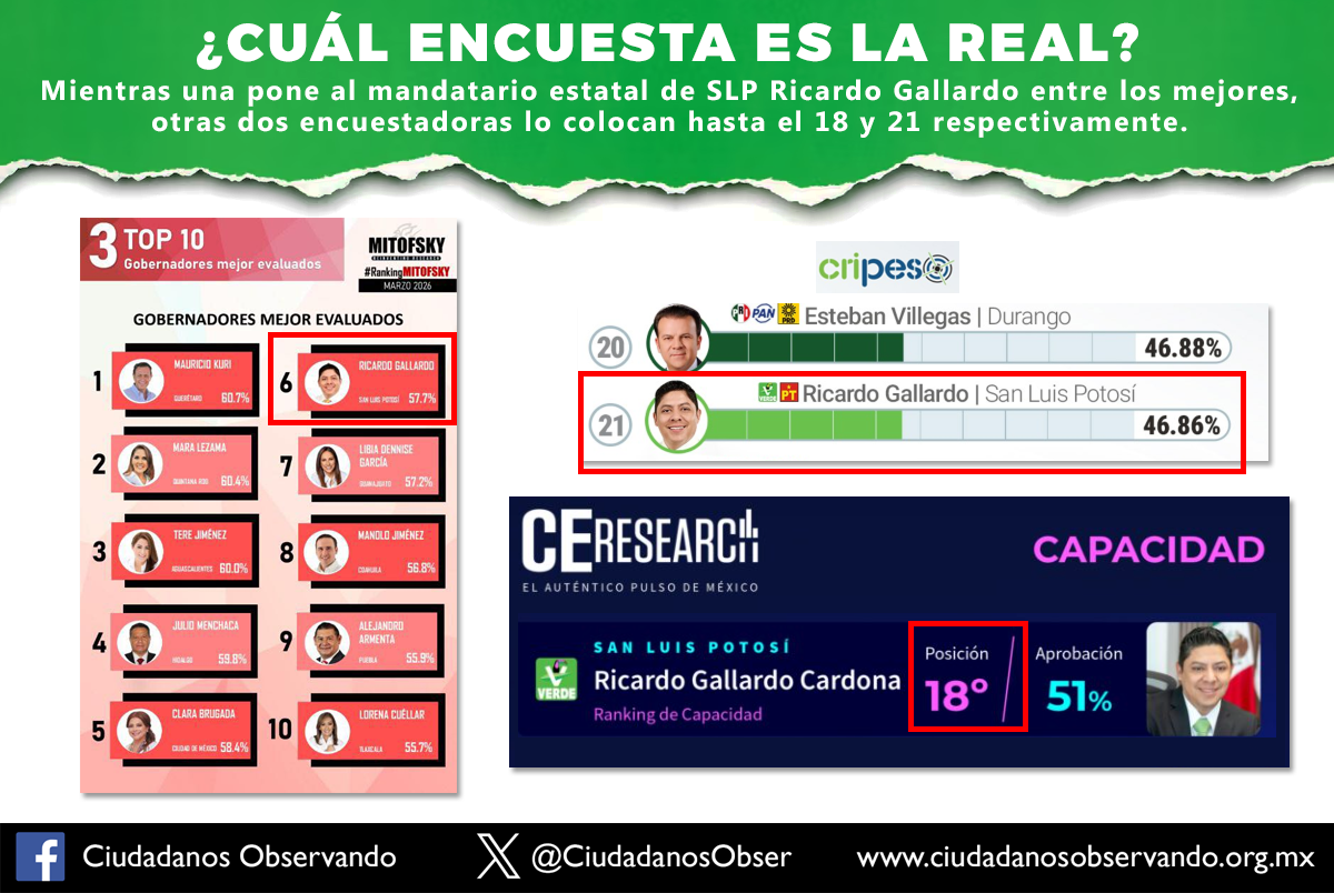 Así como el día de ayer en este mismo espacio cuestionábamos la veracidad de diversas empresas encuestadoras al publicar datos tan diferentes, hoy exponemos las mimas inconsistencias respecto a la medición que hicieron en marzo de 2026 con el mandatario estatal de San Luis Potosí, Ricardo Gallardo Cardona. Mientras la empresa Consulta Mitofsky lo coloca entre los mejores seis del país, otras tres lo colocan en lugares muy lejanos. Por ejemplo, Cripes lo coloca hasta el lugar 21, CE Research en el sitio 18 y Demoscopia en el lugar 17.