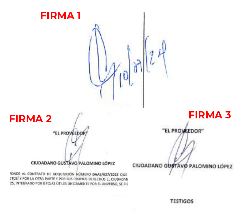 En varios de los contratos celebrados con el Ayuntamiento aparecen como autorizantes el alcalde Enrique Galindo Ceballos, el síndico municipal Víctor Hugo Salgado y el secretario general Fernando Chávez. También resulta llamativo que la presunta firma de Gustavo Palomino López varíe de manera considerable de un contrato a otro. A ello se suma otro dato revelador: en diversos procedimientos de compra por invitación restringida a tres proveedores, compitió con otras personas o empresas que tampoco fueron localizadas en los domicilios que reportaron.