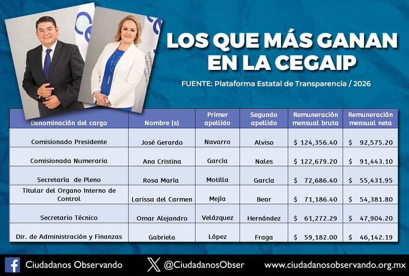 Estas son las seis percepciones doradas que mes con mes gasta la inoperante e irresponsable Comisión Estatal de Garantía de Acceso a la Información Pública (Cegaip), datos obtenidos en la Plataforma Estatal de Transparencia en este 2026.